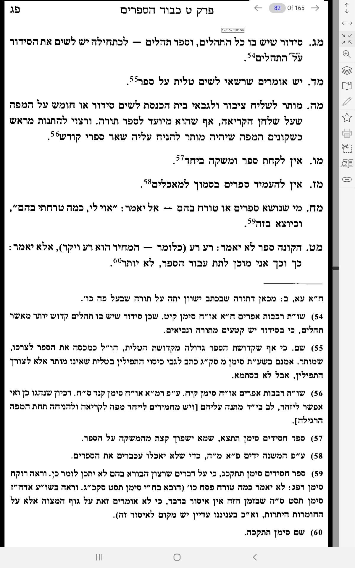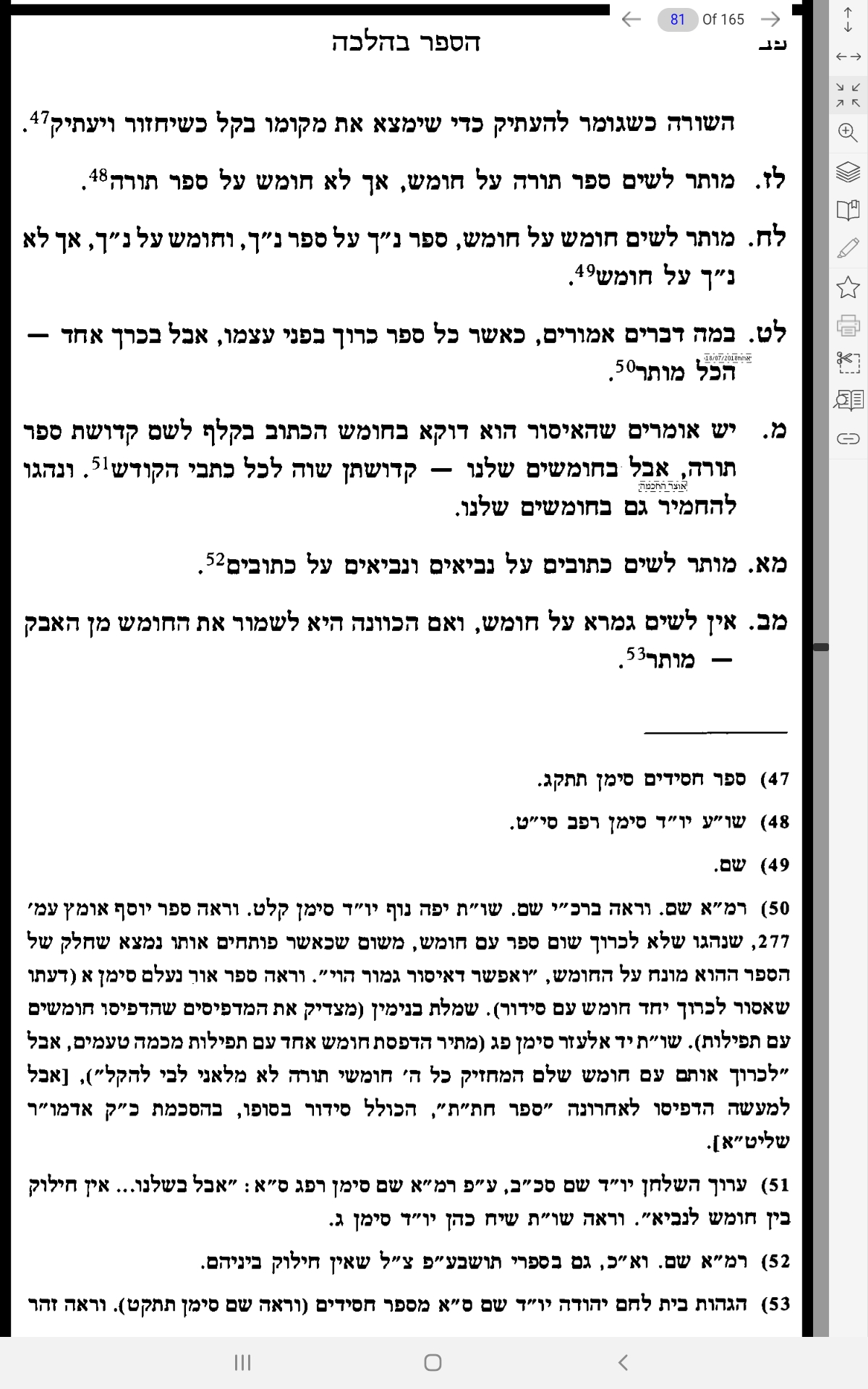 שקו״ט בקדושת סידור בכלל לענין זה (והרי י״ב פסוקי תורה, בפ׳ הקרבנות, שמע ועוד, נוסף לקריה״ת לימות החול), אם דינו כחומש, נ״ך או תושבע״פ – ראה מחזיק ברכה כה, יב. שו״ת אור נעלם א. (ולא נחית שם לזה שי״ב גם פסוקי תורה. ולכאו׳ מיירי מסידור של קינות מזמורים תחינות ופיוטים וכה״ג, עיי״ש). שו״ת רבבות אפרים א או״ח קיט. שבט הקהתי ב, רצט. בית יחזקאל צוריאל א ע׳ שמה. גנזי הקודש ג, ל. אהל יעקב שם י ואילך. הגרשז״א בקובץ מבקשי תורה ד, יט, רלה, ג. ומעשה רב ראינו כמ״פ שהוריד שאר ספרים מהסידור. ולאידך גם סידור מעל החומש (זולת בסידור שלו עצמו כמ״פ, וכנ״ל. וראה משבחי רבי ע׳ 37. ודבריו נסתרים מהמציאות, שבכל סידור יש פסוקי תורה – פרשיות הקרבנות. וגם שנהג כן גם בסידורים שיש בהם קריה״ת). וכ״ה בשיחת ש״פ ראה תש״מ. והיינו, שקדושתו כקדושת נ״ך.